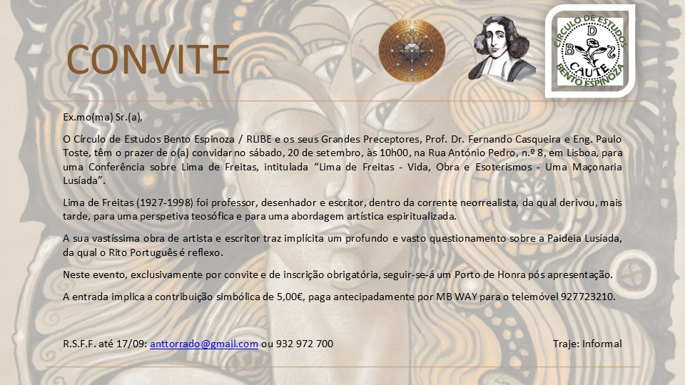 O Círculo de Estudos Bento Espinoza / RLIBE, em conjunto com os seus Grandes Preceptores, Prof. Dr. Fernando Casqueira e Eng. Paulo Toste, organiza no próximo dia 20 de setembro, às 10h00, uma conferência dedicada a Lima de Freitas (1927-1998), sob o tema “Lima de Freitas – Vida, Obra e Esoterismos – Uma Maçonaria Lusíada”. O encontro terá lugar na Rua António Pedro, nº 8, em Lisboa.